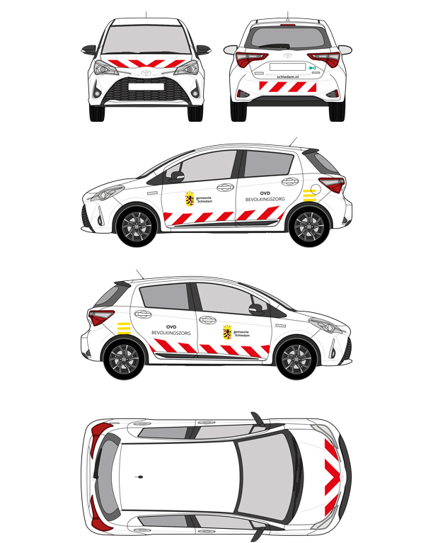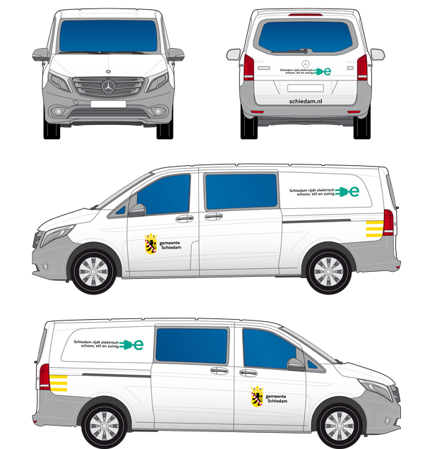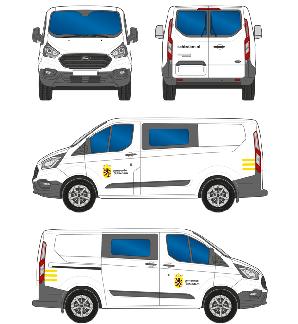 Met een flexibel wagenpark en hetzelfde logo is de gemeente direct herkenbaar in het verkeer. Voertuigen hebben in de regel gemeente Schiedam als enige afzender. Het standaard fullcolour logo is het uitgangspunt. Het vlagelement in Schiedams geel wordt zoveel mogelijk toegevoegd.