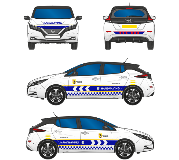 De wagenparkmarkering voor handhavers van de gemeente Schiedam is omwille van herkenning en veiligheid afwijkend van de standaard wagenparkmarkering. Het wagenpark heeft een duidelijke herkenbare striping met het woord ‘Handhaving’ conform de landelijke Beboa richtlijnen. Voor voertuigen die zeer regelmatig stil (moeten) staan op gevaarlijke plaatsen in het verkeer is het belangrijk op te vallen.