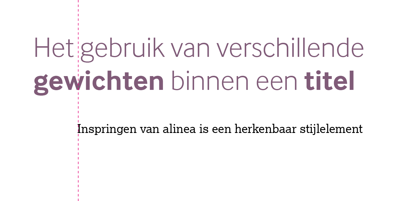 De standaard alineastijlen (paragraph styles) zijn opgenomen in de InDesign-basisbestanden. De corpsgrootte van titels en koppen is variabel. Typografie mag in alle huisstijlkleuren worden toegepast, maar let op een goede leesbaarheid.