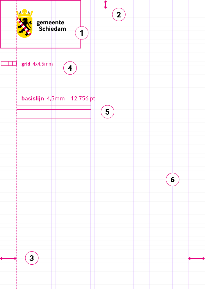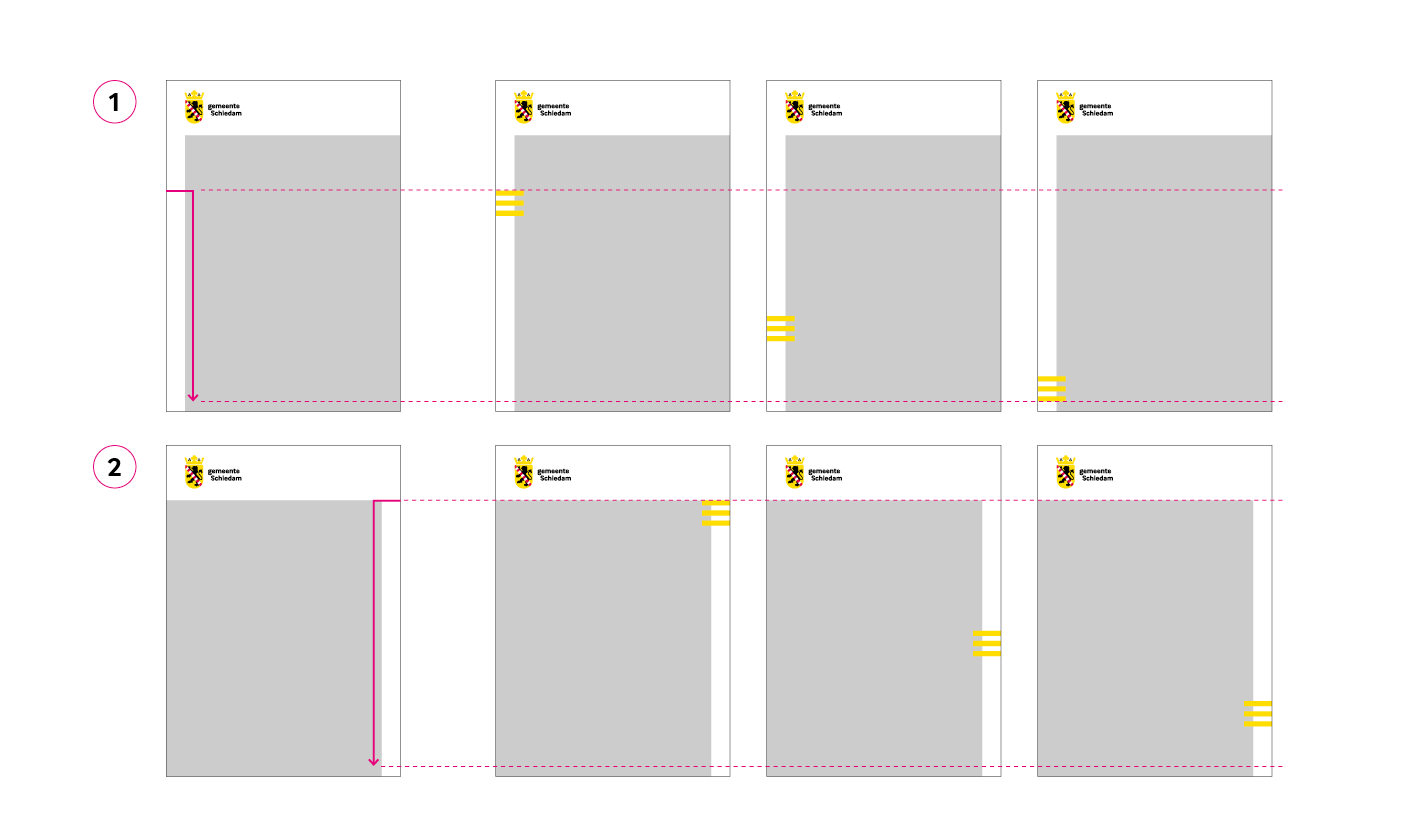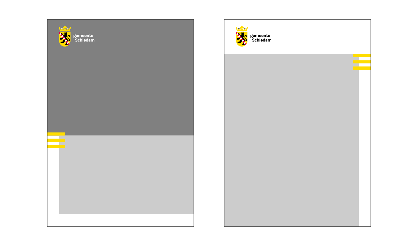 De huisstijl van gemeente Schiedam biedt veel ruimte om verschillende communicatieboodschappen een eigen gezicht te geven. De lijnen van het documentgrid vormen de basis voor de plaatsing van kleurvlakken of kaders voor fotografie of illustratie. In de lay-out is altijd witruimte zichtbaar om visuele openheid te creëren. Vlakken voor fotografie of kleur zijn daarom nooit geheel aflopend aan vier zijden.