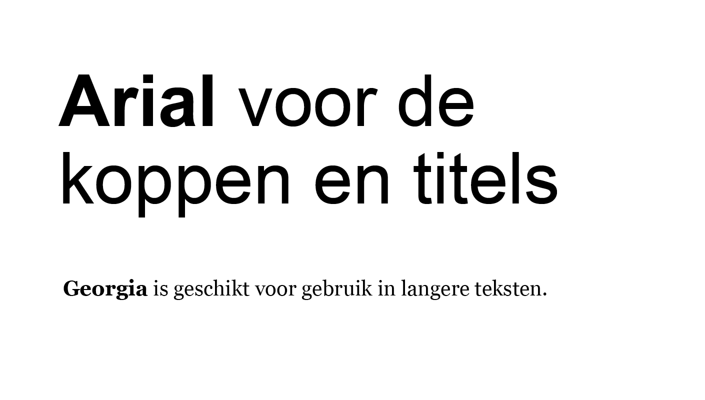 In een kantooromgeving worden communicatiemiddelen gemaakt in office-applicaties, zoals rapporten in Word of digitale presentaties in Powerpoint. Voor deze communicatiemiddelen is gekozen voor de systeemlettertypes Arial en Georgia. Deze lettertypes zijn standaard beschikbaar op alle computers en sluiten in gevoel goed aan bij de huisstijlletters Interface en Lexia.