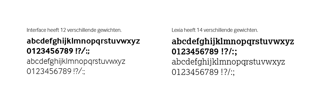 Online worden de websafe huisstijlletters Interface en Lexia gebruikt. In digitale middelen en als fallback in online middelen zoals een digitale nieuwsbrief kán ook Arial en Georgia ingezet worden.